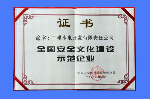 2012年5月9日-10日,国家安全生产监督管理总局在甘肃省金昌市组织召开了2012年全国安全生产宣传工作会议暨安全文化建设现场会。会上,二滩公司被国家安全生产监督管理总局授予“全国安全文化建设示范企业”荣誉称号。