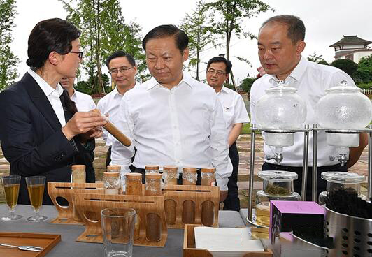 2018年7月10日上午,四川省委书记彭清华、省委秘书长王铭晖一行来四川蒙顶山茶业有限公司(以下简称:蒙顶山茶业公司)牛碾坪现代茶叶科技中心调研茶旅融合发展情况,雅安市委书记兰开驰、名山区委书记金武、蒙顶山茶业公司董事长兼总经理高红梅陪同。