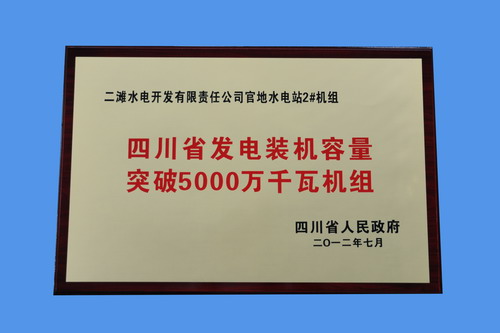 7月2日下午,四川省人民政府在二滩公司集控大楼会议中心2楼会议厅举行“四川省电力建设新闻发布会暨发电装机突破5000万千瓦授牌仪式”,省政府副省长王宁向二滩公司雅砻江官地水电站2号机组授予“四川省电力装机容量突破5000万千瓦机组”牌匾。仪式由四川省政府副秘书长、研究室主任万鹏龙主持,四川省发改委副主任邵小龙现场通报了四川省电力建设情况,国家开发投资公司副总裁李冰、二滩公司总经理陈云华在仪式上致辞,米兰(中国)公司副总经理伍康定出席授牌仪式,人民日报、新华社、中国新闻社等9家媒体记者对仪式进行了报道。
