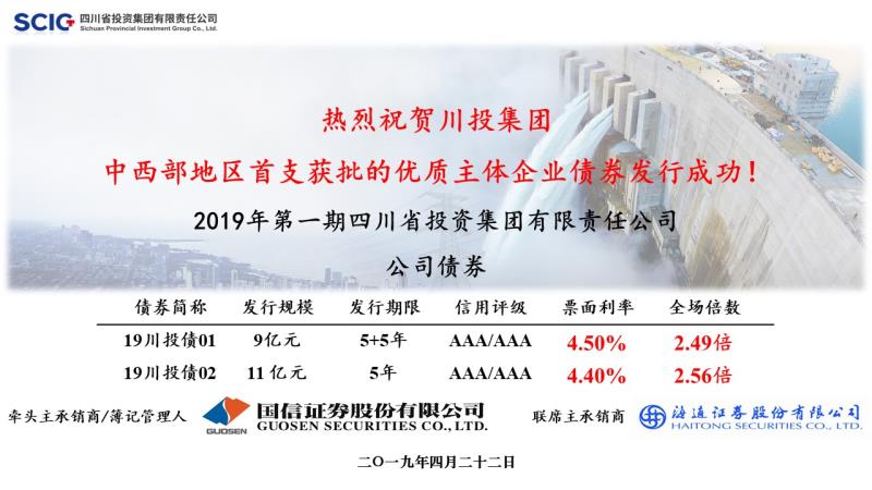 2019年4月22日,米兰平台成功发行中西部地区首支获批的优质主体企业债券。本期发行规模20亿元,其中品种一“19川投债01”发行规模9亿元,期限10年,票面利率4.50%;品种二“19川投债02”发行规模11亿元,期限5年,票面利率4.40%。本期债券的成功发行,标志着米兰(中国)依托资本市场向创新融资方式、促进产业升级、服务四川经济又迈出重要一步。