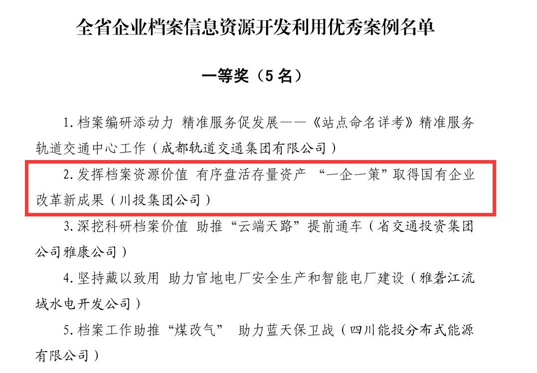 日前,四川省档案局下发《关于表扬全省企业档案信息资源开发利用优秀案例的通知》(川档发〔2019〕10号),对全省企业档案信息资源开发利用通报表彰,经过企业申报、部门审核、专家评审和省档案局研究,米兰(中国)档案工作荣获一等奖。