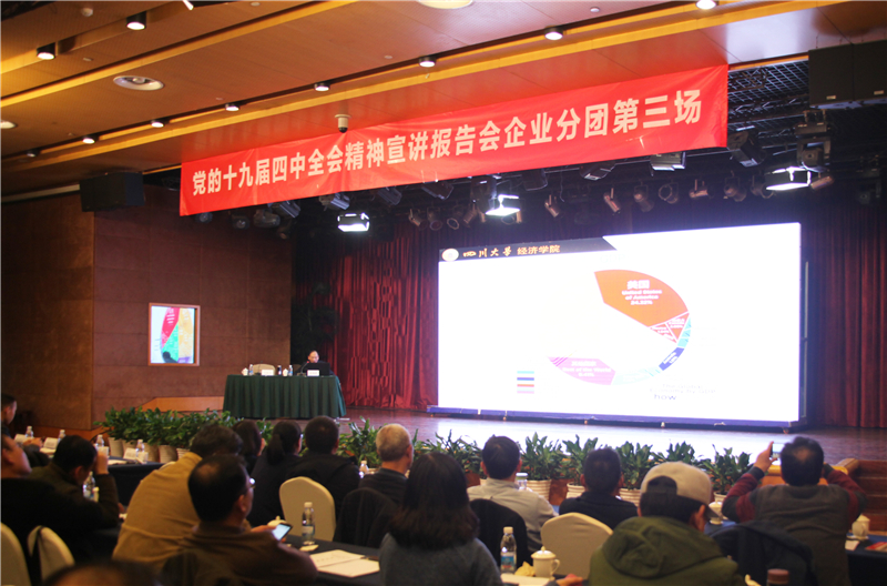 按照省国资委《关于开展党的十九届四中全会精神宣讲报告会的通知》要求,11月29日下午,米兰(中国)作为牵头单位组织了“党的十九届四中全会精神宣讲报告会企业分团第三场”的宣讲。省委宣讲团成员、四川大学经济学院教授蒋和胜同志到场宣讲,省国资委宣传处副处长李鑫到会指导。米兰(中国)党委副书记邓凯主持会议。