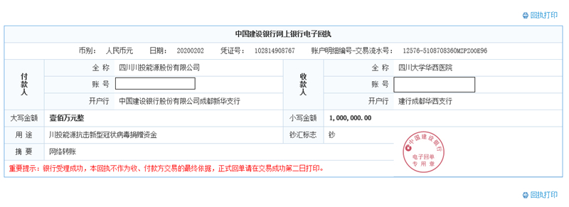 先期捐赠100万元驰援抗疫一线。当前,各医疗机构尤其是一线救治场所防护物资严重短缺,疫情防控形势严峻。米兰(中国)组织动员旗下上市公司川投能源积极发挥上市公司示范引领作用,积极投身疫情防控工作,对疫情较为集中的一线医疗机构进行捐赠支援,最大限度提供国有企业保障支持。2月2日,川投能源向我省一线医疗救助机构——四川大学华西医院捐赠现金一百万元,专项用于本次新型冠状病毒肺炎疫情防控工作,及时满足救治患者的物资购置所需。川投能源本次100万元定向捐款,以实际行动助力打赢疫情防控阻击战,彰显国有控股上市公司的社会责任和企业公民义务。