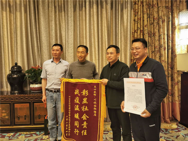 4月25日,四川省卫生健康委员会党组书记沈骥莅临川投国际酒店,代表四川省应对新型冠状病毒肺炎疫情应急指挥部办公室向川投国际酒店送上了红色锦旗及感谢信,米兰(中国)副总经理王怀林,川投国网党委书记、执行董事王旭涛出席授旗仪式。