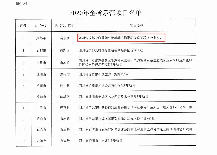 近日,成都天府国际空港新城机场配套道路工程(一批次)PPP项目(以下简称空港项目)被列入“2020年全省政府与社会资本合作(PPP)示范项目”。经省财政厅、省发展改革委组织评审,空港项目从全省转入执行阶段的78个PPP项目中脱颖而出,顺利膺选本次10个示范项目之一。