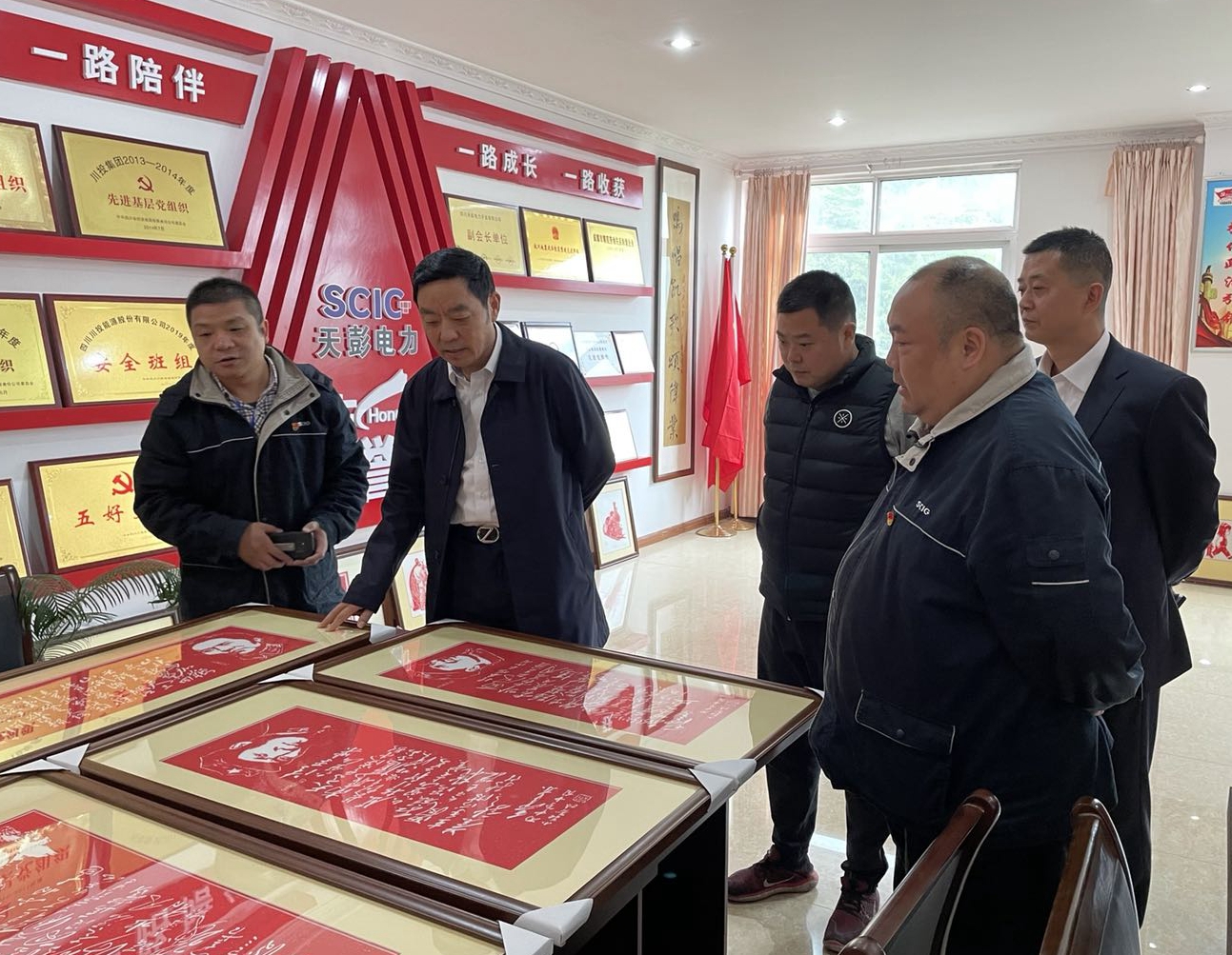 邓凯一行实地查看了天彭电力基层党组织阵地、凤鸣桥车间和“小庄工作室”。本次集团庆祝建党100周年剪纸展览主要依托天彭电力党员庄丛灿老师的“小庄工作室”积极筹备,庄丛灿老师是非遗剪纸文化传承人,将带领其他3名党员职工在5月底前完成100幅以共产党成立100周年重大历史脉络的剪纸创作。邓凯一边仔细阅看庄丛灿老师已完成的剪纸作品,一边和他亲切交谈,详细了解剪纸创作情况,充分肯定了其剪纸作品的艺术成果,并代表集团党委送上了深切的关怀和慰问。