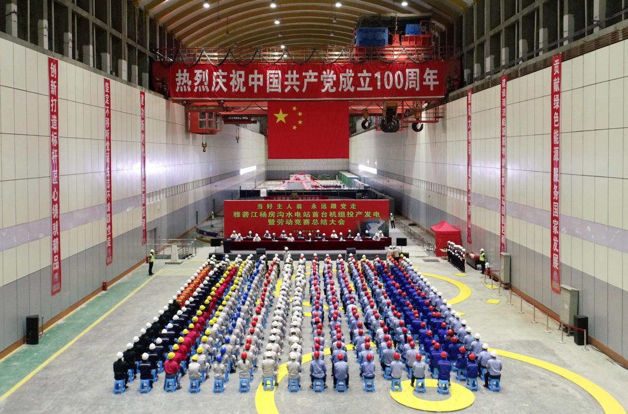 7月6日,雅砻江杨房沟水电站首台机组投产发电暨劳动竞赛总结大会在杨房沟水电站地下厂房召开。