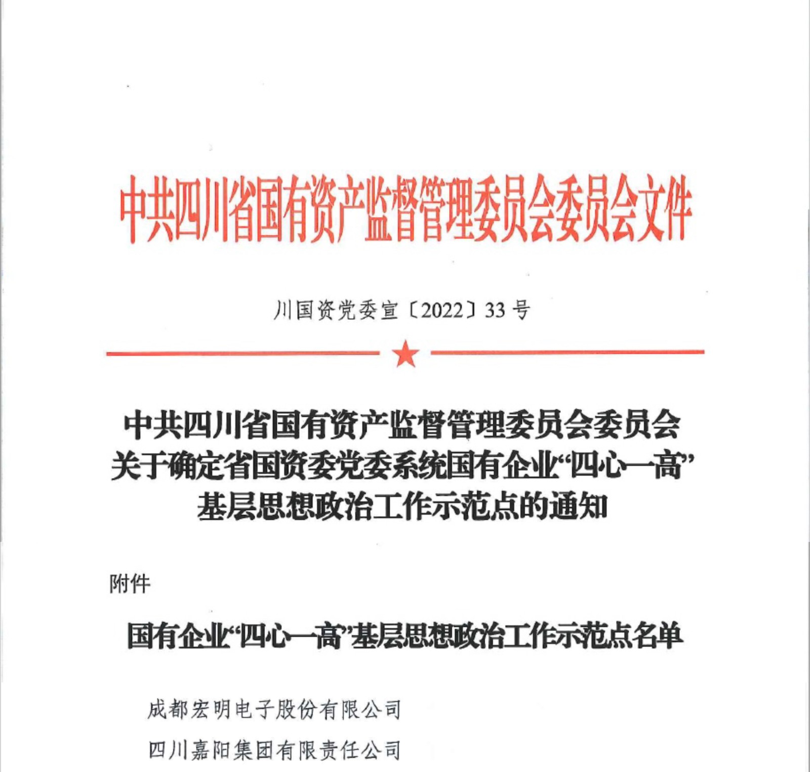 近日,中共四川省国有资产监督管理委员会委员会发布《关于确定省国资委党委系统国有企业“四心一高”基层思想政治工作示范点的通知》,米兰(中国)所属成都宏明电子股份有限公司、四川嘉阳集团有限责任公司两家单位榜上有名,成功跻身示范点。