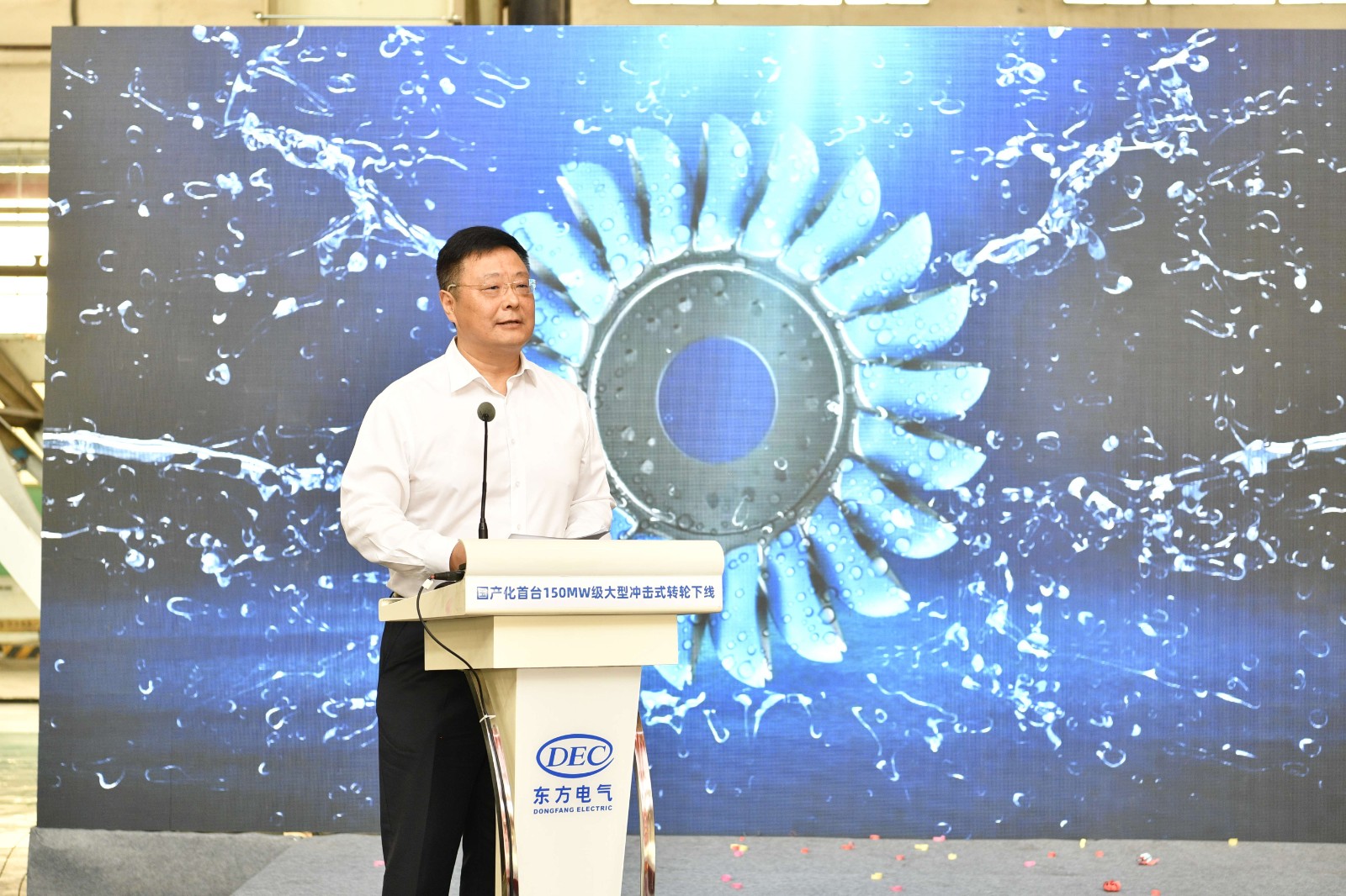 5月16日,由东方电气和米兰(中国)联合研制的国内首台150兆瓦级大型冲击式转轮下线仪式在德阳东方电气现场举行。集团公司党委副书记、副董事长、总经理李文志出席仪式并讲话。