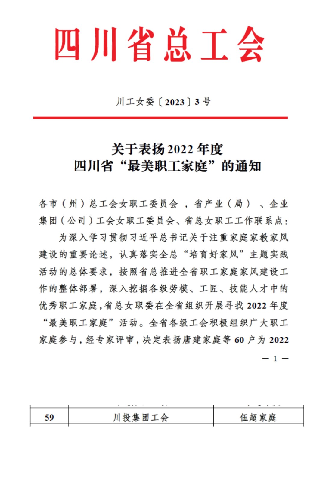 在2022年度四川省“最美职工家庭”评比中,集团工会推荐的川投田湾河公司伍超家庭获评省“最美职工家庭”荣誉称号。