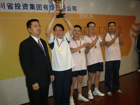 晚上7:00,川投峨铁队与聚酯公司队的冠亚军争夺战开战,这场比赛吸引了众多的观众,集团总经理助理杨勇也兴致勃勃地到场观战。这是一场代表米兰(中国)最高水平的决战。赛场上,决战双方严阵以待,教练员、运动员表情凝重,紧张气氛在场上弥漫。随着裁判长一声令下,双方运动员立即投入战斗,高抛发球、近台抽调、远台扣杀、正拉反挡,比分在运动员激烈的对抗中交替上升,乒乓球在双方顽强的扣杀中上下翻飞。场外观众已被这精彩绝伦的比赛深深吸引了,为运动员每一次精彩对攻加油、喝彩,也为运动员每一次奋力扑救失误而惋惜、鼓劲,最后,川投峨铁队以3:0胜出。至此,川投峨铁队以六战全胜的战绩捧得男子乒乓球团体赛的金杯,聚酯公司队获得亚军。在另外一场争夺三、四名的比赛中,巴蜀电力队战胜了川投能源队,获得第三名。