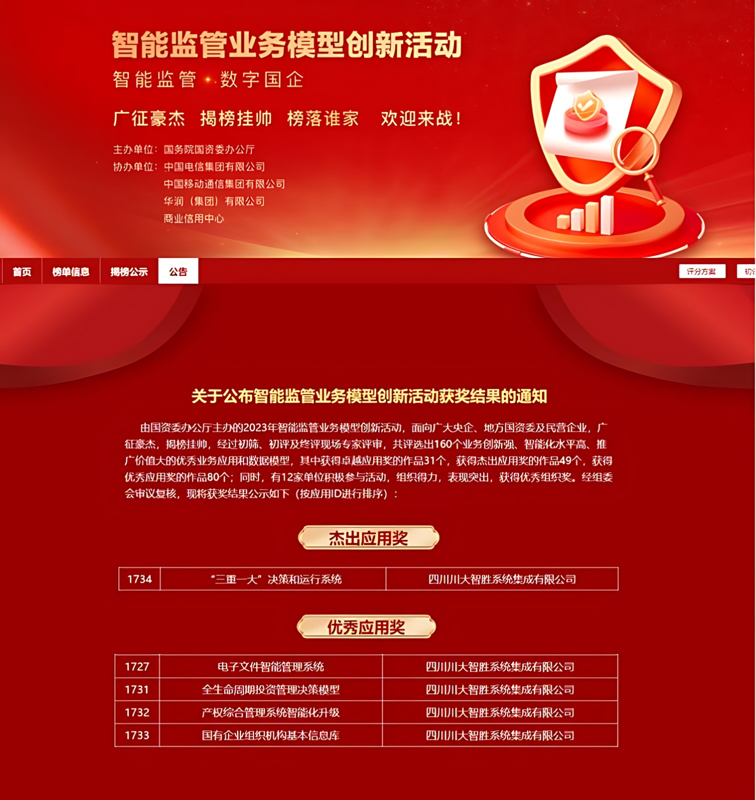 在经历初筛、初评和专家评审等系列评选程序后,智胜集成“‘三重一大’决策和运行系统”荣获“杰出应用奖”,“电子文件智能管理系统”“全生命周期投资管理决策模型”“产权综合管理系统智能化升级”“国有企业组织机构基本信息库”四项应用荣获“优秀应用奖”。