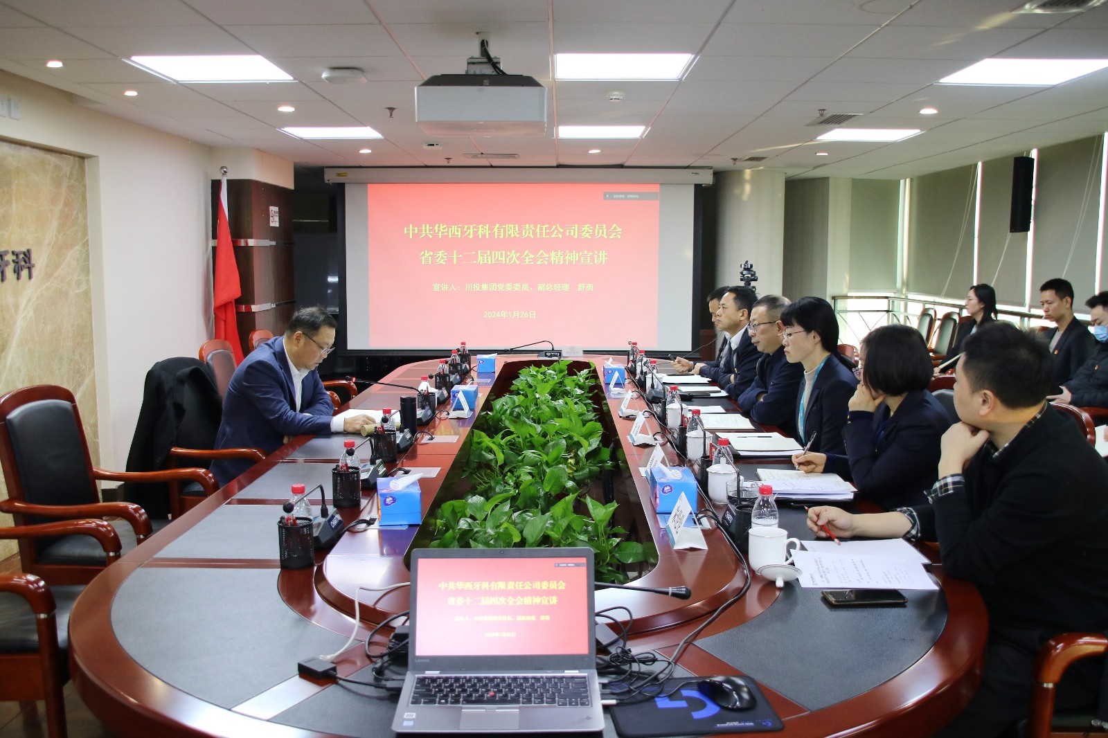 1月26日上午,集团公司党委委员、副总经理舒勇赴华西牙科开展春节走访慰问活动,并进行省委十二届四次全会精神宣讲。