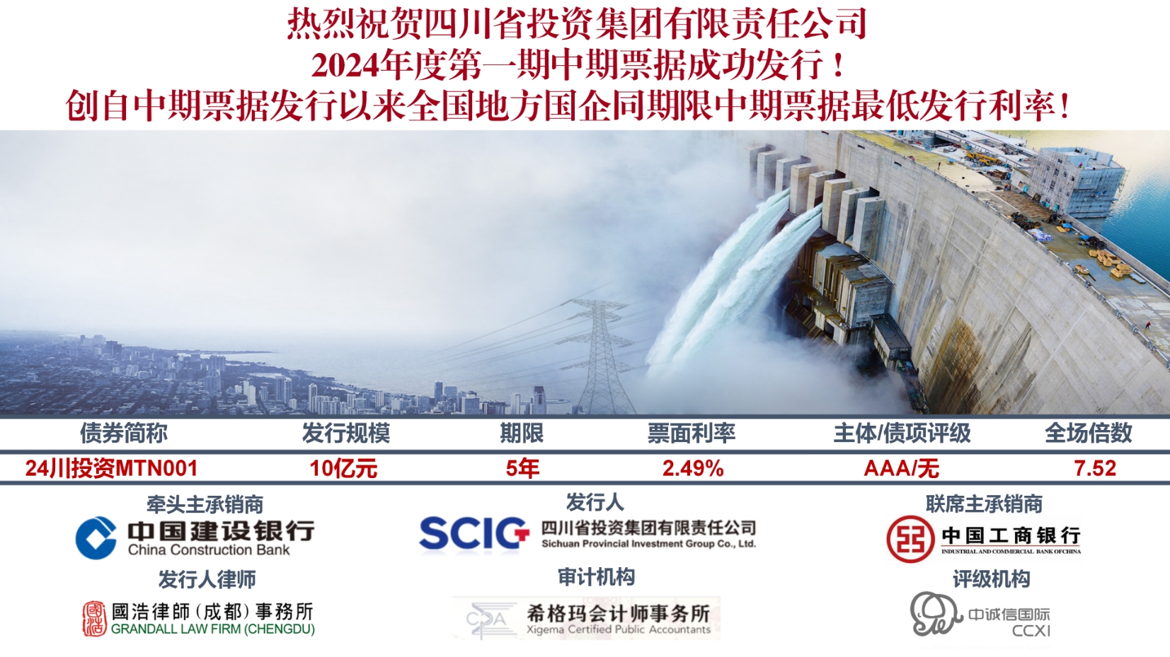 4月18日,米兰(中国)成功发行2024年度第一期中期票据,创下自中期票据发行以来四川省同期限中期票据最低发行利率和全国地方国企同期限中期票据的最低发行利率记录。