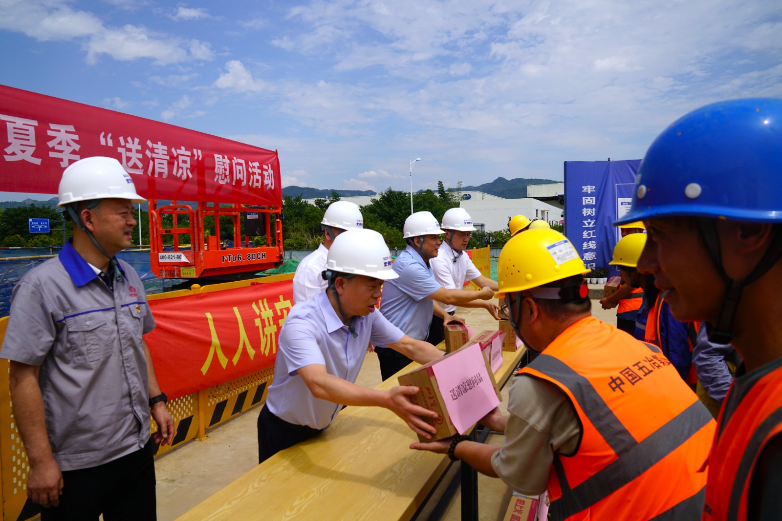 随后,肖长青在施工现场与一线建设工人进行亲切交谈,询问工作、生活情况,感谢他们的坚守和付出,并叮嘱要树牢安全意识,合理调配工作时间,注意防暑降温,以健康的身体和饱满的精神状态投入建设工作中。随后,他为项目建设一线员工送上了水果、凉茶等防暑降温物品,切实把关怀送到员工手中。