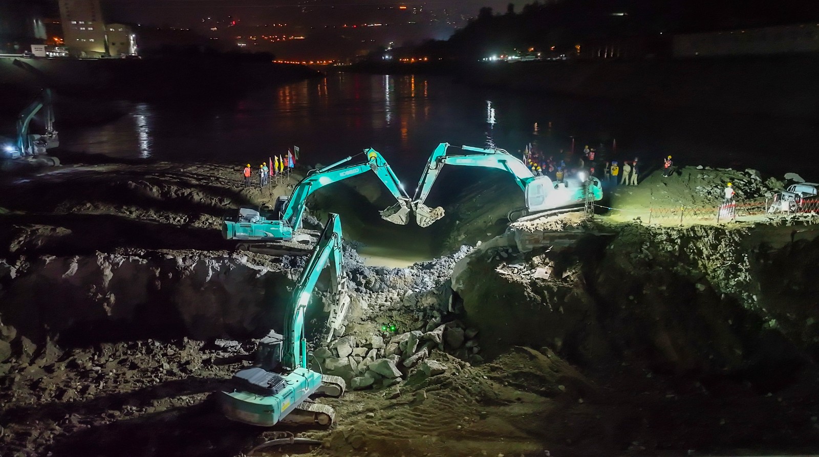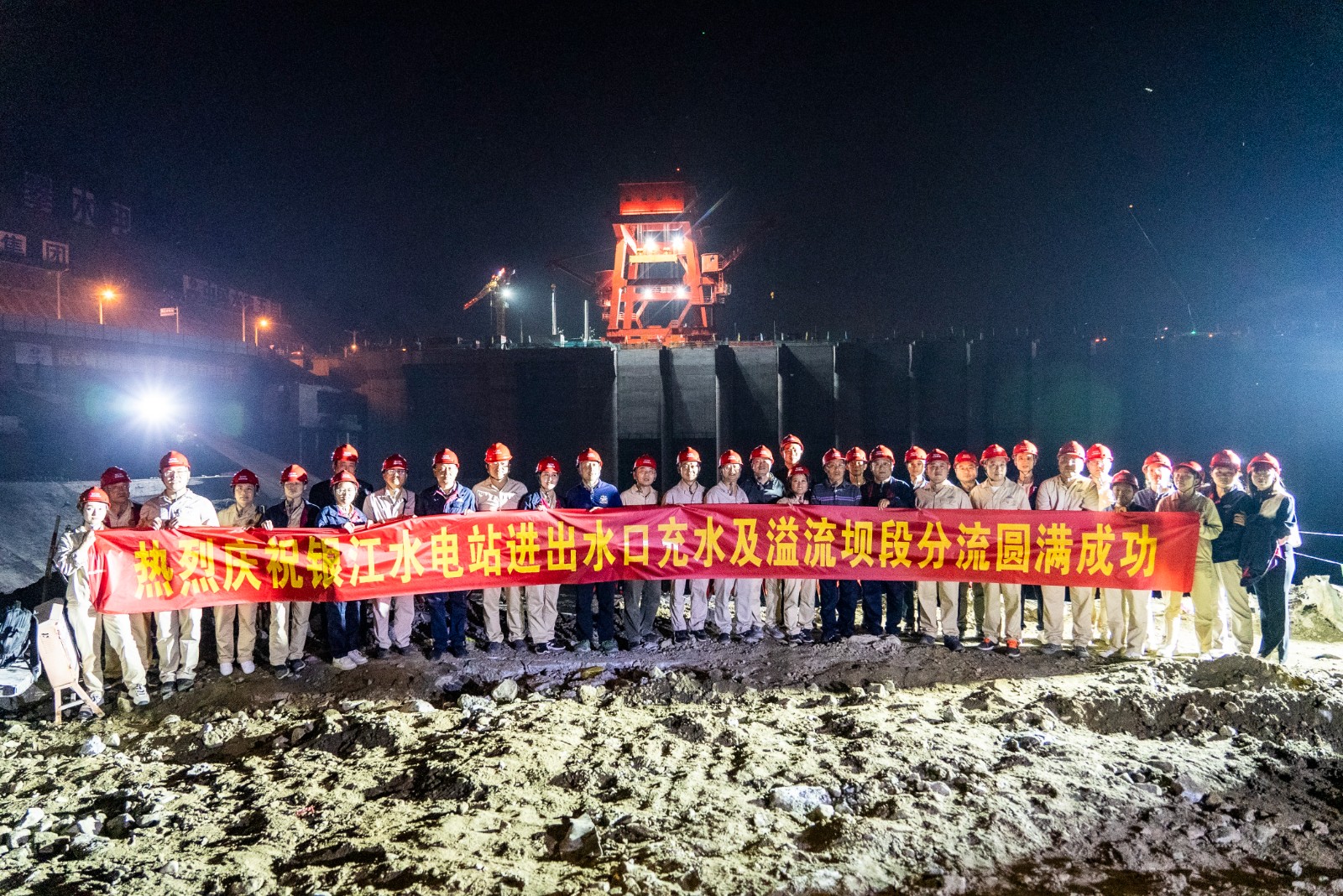 10月25日晚,随着指令响起,十余台挖掘机在二期上游围堰右岸进行破口开挖,奔腾的金沙江水随即涌入主河床厂房与溢流坝上游,充水平压后江水经溢流坝段流向下游,银江水电站成功实现分流。这一重要进展为按期完成导流明渠截流打下坚实基础,也标志着银江水电站首台机组投产发电正式进入倒计时阶段。