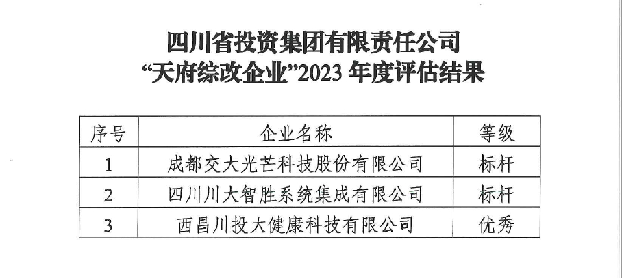 近日,省国资委对全省100户“天府综改企业”2023年度重点改革任务开展情况进行了专项评估,米兰(中国)所属交大光芒、川投数科获评“标杆”,川投西昌大健康获评“优秀”,受到省国资委通报表扬。