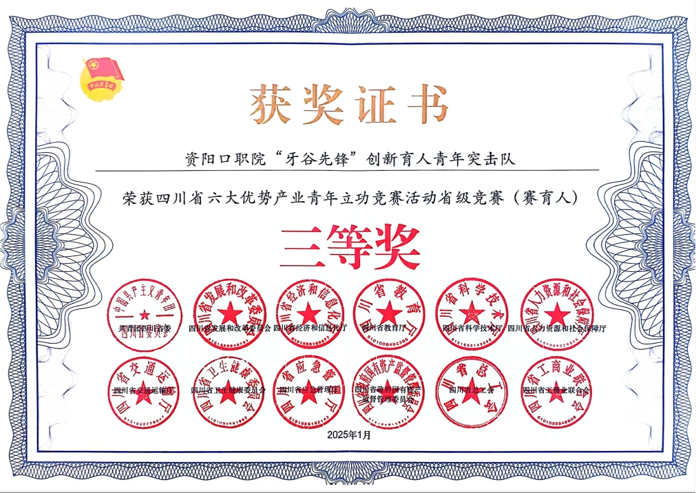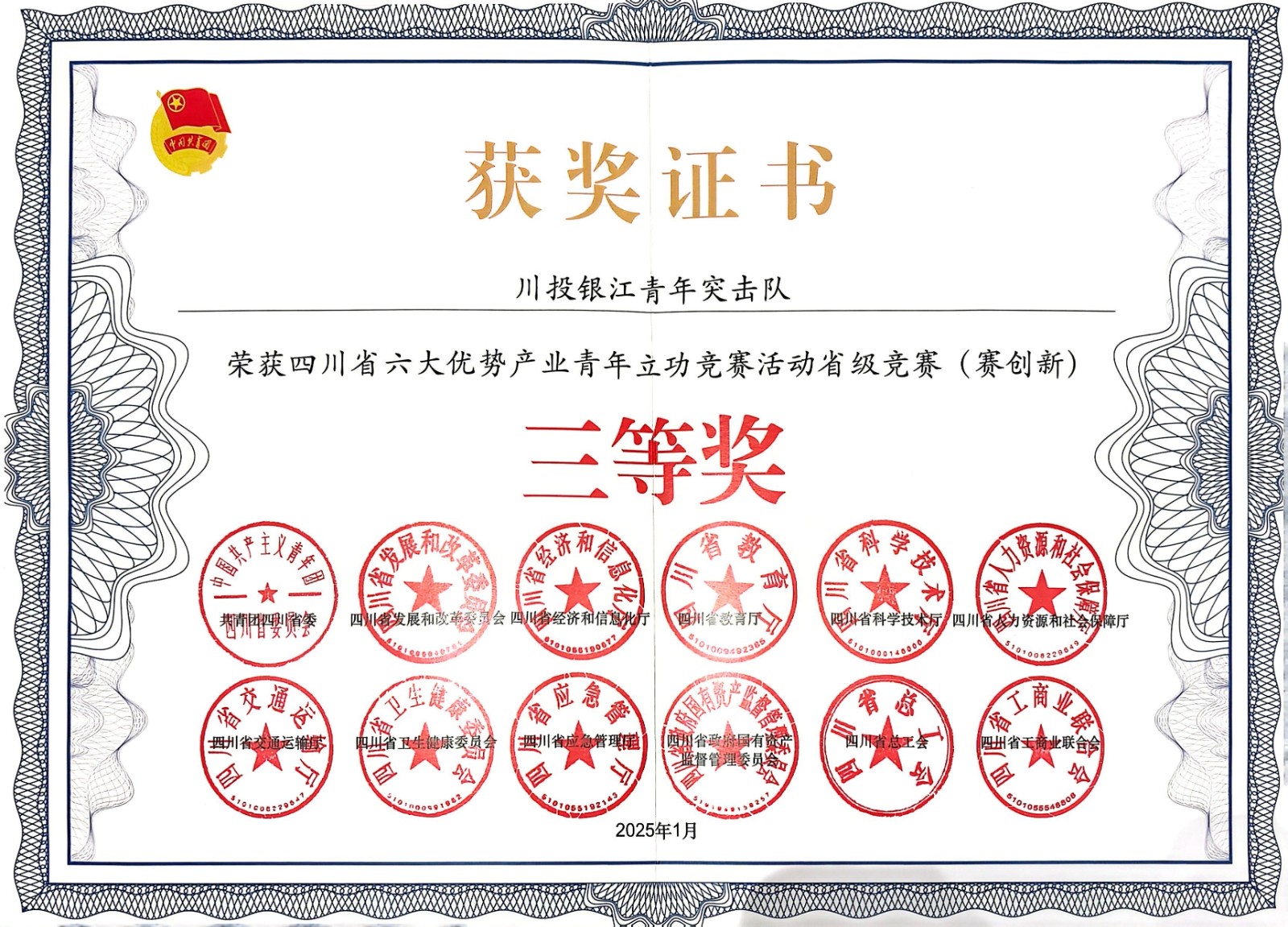 1月8日,四川省六大优势产业青年立功竞赛活动颁奖仪式在成都举行。川投银江青年突击队、资阳口职院“牙谷先锋”创新育人青年突击队从全省415支青年突击队中脱颖而出,分别荣获赛创新、赛育人三等奖。
