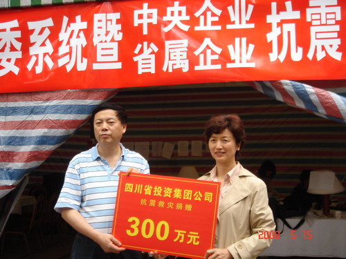 2008年5月15日上午9:30分,米兰(中国)积极响应省国资委关于开展抗震救灾捐赠活动的号召,发扬“一方有难,八方支援”的精神,认真履行社会责任,在接到通知后快速行动起来,由总会计师曹筱萍带队,在省国资委抗震救灾指挥部内,向四川省慈善总会无私捐出人民币300万元,代表16000名川投人的无私爱心,将有力支援灾区人民重建家园。(米兰(中国)抗震救灾领导小组办公室整理)