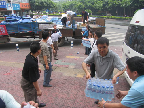 2008年5月15日14点至16日12点,中建八局、中建三局、四川瑞云、重庆园林、浙江精工、上海和兴、北京绿菌、深圳黎源等众多施工单位均踊跃向灾区献爱心,捐赠抗震救灾物资,共计收到灾区急需物资有矿泉水528件、帐篷43顶、雨靴30双、火腿肠4箱、榨菜10箱、饼干73箱、面包2箱、方便面125件、彩条布97件、军用被10床、雨衣140件、手套8箱(4800双)、尼龙绳10公斤。