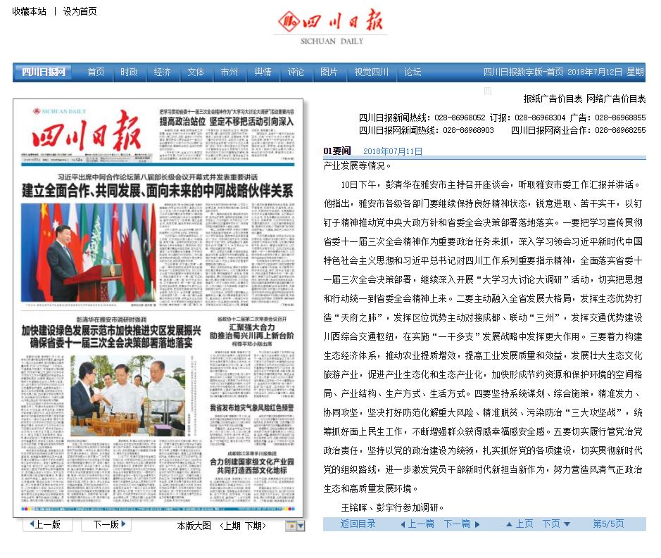 调研期间,彭清华还前往雅安火车站暨综合客运枢纽项目建设现场、芦天宝飞地产业园区、中国兵装集团四川建安公司,实地调研重大交通基础设施建设、特色产业发展等情况。
