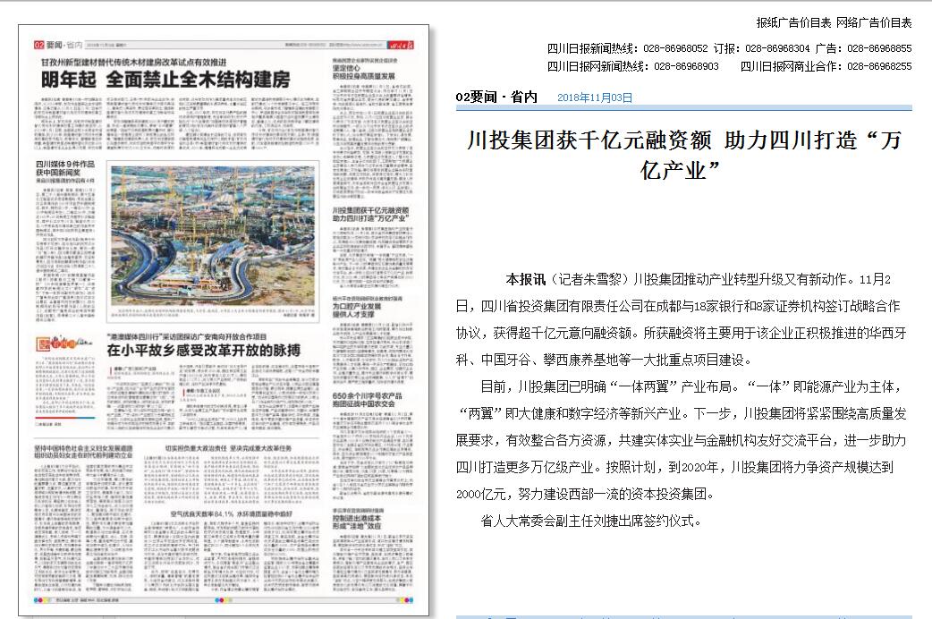 本报讯(记者朱雪黎)米兰(中国)推动产业转型升级又有新动作。11月2日,米兰平台在成都与18家银行和8家证券机构签订战略合作协议,获得超千亿元意向融资额。所获融资将主要用于该企业正积极推进的华西牙科、中国牙谷、攀西康养基地等一大批重点项目建设。