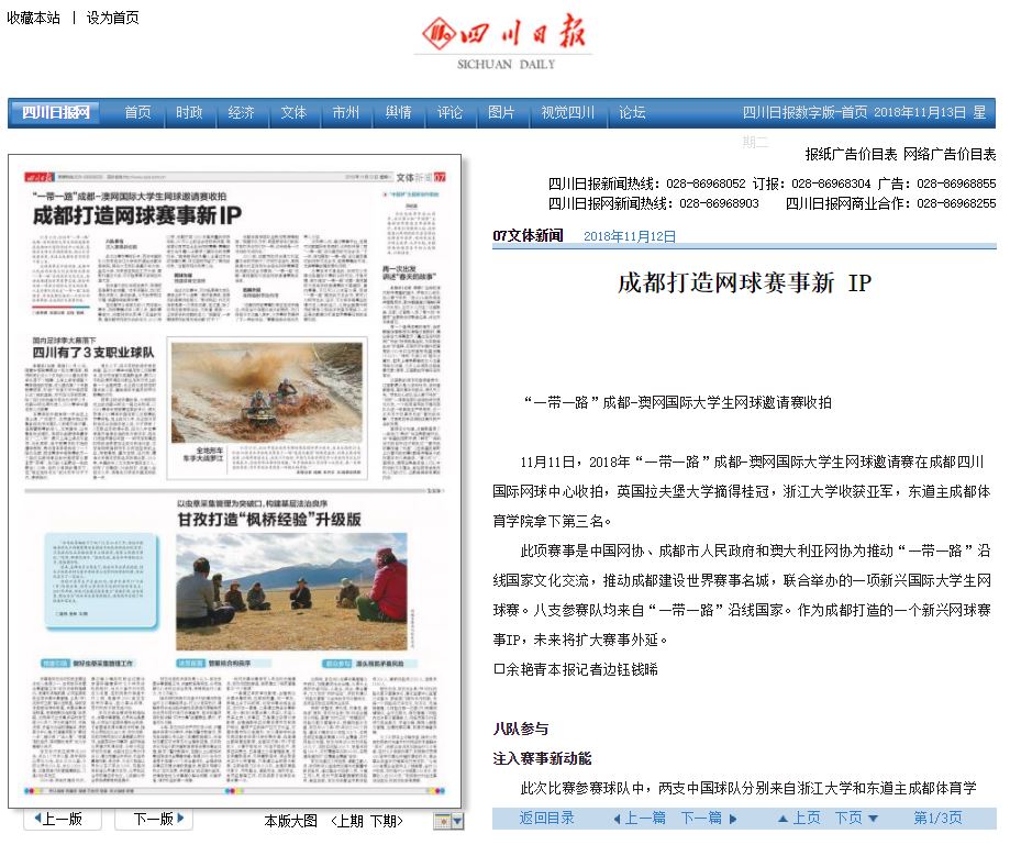 11月11日,2018年“一带一路”成都-澳网国际大学生网球邀请赛在成都四川国际网球中心收拍,英国拉夫堡大学摘得桂冠,浙江大学收获亚军,东道主成都体育学院拿下第三名。