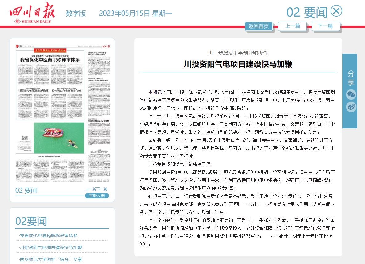 “马力全开,项目实际进度较计划提前约2个月。”川投(资阳)燃气发电有限公司执行董事、总经理梁红兵介绍,公司认真组织开展学习贯彻习近平新时代中国特色社会主义思想主题教育,牢牢把握“学思想、强党性、重实践、建新功”的总要求,把主题教育成果转化为项目推进动力。