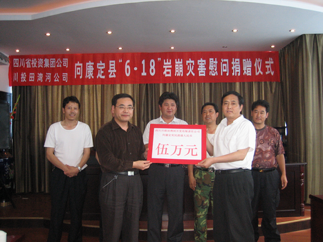 6月18日,仁宗海工程所在地康定县发生岩崩自然灾害,造成11人死亡,6人受伤,房屋、道路、牲畜等财物损失达2000多万元。闻此消息后,经口头向集团公司领导请示同意,公司总经理孙志祥于6月20日前往康定县时济乡灾区向康定县救灾工作组并通过他们向灾区人民转达了川投领导、田湾河公司和全体川投员工的慰问,并捐助伍万元慰问金。