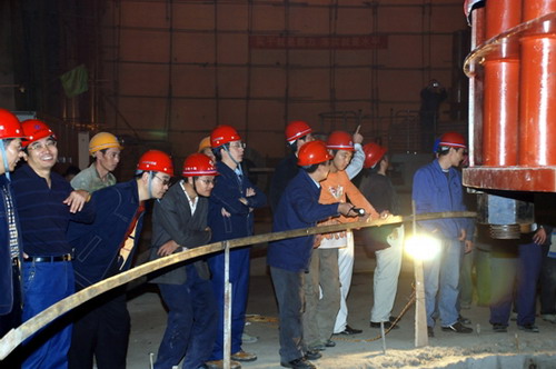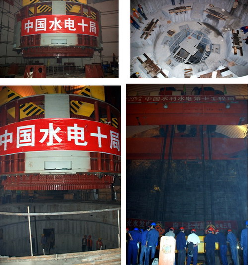 9:20时,在一声清脆的哨响之后,170吨重的定子缓缓离开支墩,向着机坑慢慢移动。整个吊装过程指挥有序、移动平稳。经过25分钟的紧张作业,2#发电机定子于9:45时顺利地成功吊入机坑。