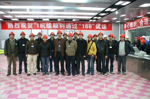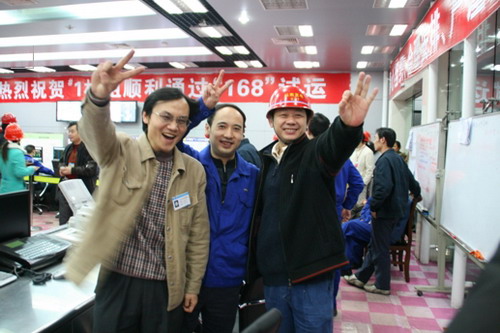 12月12日凌晨,川南发电公司领导和各部门中层管理人员,四川电力调试所、四川电力设计院、四川电力建设三公司等参与了此次#1机组试运工作的相关单位领导都早早的来到了生产现场,一起守候成功的历史时刻。随着6点26分的到来,原本庄严的川南发电公司集控室响起了经久不绝的鼓掌声,在厂大门外点燃了各相关单位共同集合的66万响鞭炮。川南发电公司总经理李胜章代表公司和广大参与#1机组设计、施工和调试单位宣布:四川泸州川南发电公司#1机组168试运成功通过!在集控室内的人都在相互祝贺,一脸的笑意都冲淡了十多天连续奋战后的疲惫,人们共同在这历史性的一刻纷纷合影留恋。
