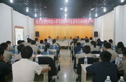 二、紧紧抓住发展机遇,着力解决实现科学发展观的主要问题。唐书记在报告中根据科学发展观的内涵对公司的发展进行了思考性分析:一是关于科学发展“第一要义是发展”的思考。首先我们要充分肯定公司从建设到投产以来所取得的显著成绩。与此同时,也要高度重视已经面临或将要面临的挑战:当前多晶硅市场供求严重失衡,价格爆涨,引发了国际、国内多晶硅扩建、新建的高潮;近期发生的国际金融危机对多晶硅产业的影响。我们要防止和消除骄傲自满和妄自菲薄悲观情绪,完成今年800吨多晶硅生产任务,多增产、多增收、多争效,为今后轻装上阵参与竞争打下基础。二是关于科学发展“核心是以人为本”的思考。我们要看到公司在前期人才队伍建设和员工建设方面取得的成绩。我们人才的优势在于聚集了一批技术精湛,具有丰富实践经验,享有声誉的技术专家团队。同时也我们要看到目前公司技术人才“青黄不接”的断层现象,公司在主工艺一些关键技术岗位上能挑大梁,独挡一面的中青年技术人才不多,各工序,各工种的高技能者不多。因此我们应以此次学习实践活动为动力,加快创新体制机制,培训人才和稳定人才。三是关于对科学发展“全面、协调、可持续“的思考。我们要居安思危,增强忧患意识,提前谋划未来,继续坚定新光硅业“做中国第一,创世界一流”的雄心壮志。在年产量规模已定的情况下,我们要明确公司多晶硅面向以电子级为代表的高端市场定位,坚持把走技术创新和质量效益型道路作为发展导向。在国内同行业做到人无我有,人有我优,敢与国外同行同台竞技。紧紧抓住和依靠技术创新优势,在企业的综合实力上 “做中国第一,创世界一流”。四是关于对科学发展观“根本方法是统筹兼顾”的思考。我们在处理好增产与提高和稳定产品质量之间的关系;当期多创效益与增加投入促进企业可持续发展之间的关系;增产增效与加强安全环保之间的关系;加快技术创新与加强专利技术、专有技术保护之间的关系;开展对外技术咨询、人员培训与加强公司技术保密之间的关系;努力提高员工收入与加强员工人生观、价值观教育之间的关系,努力把新光公司打造成三个基地(多晶硅精品生产基地、技术和工艺研发创新成果基地、多精硅技术和管理人的成才基地),在科学发展中实现股东多得回报,国家多得税收,员工多得实惠的“三赢”局面。