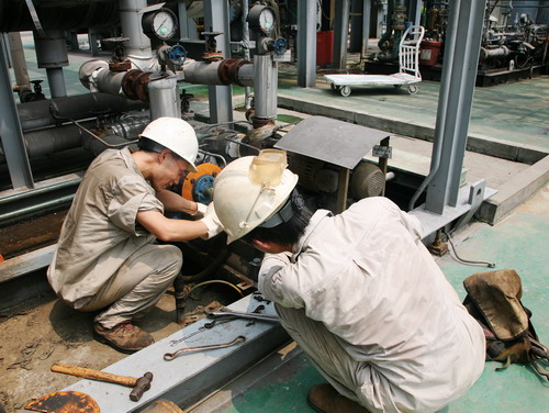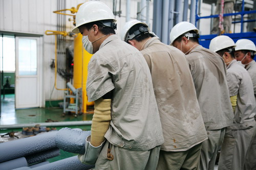 每年七月、八月高温天气是多晶硅生产设备故障的频发期,十分不利于多晶硅的生产。尤其在今年,持续的高温“烤”验着新光人的意志和多晶硅生产设备的安全。为了实现月产100吨的目标,新光人怀着饱满的热情,坚持奋战在一线。我们看到:烈日下的巡检人员,认真仔细地对工序设备仪表进行检查,没有半点松懈,工作服被汗水浸湿一次又一次;设备检修员顶着烈日、冒着酷暑,顺利完成了HCl冷凝单元压缩机、盐水冷冻机组、氢化炉检修、淋洗塔清堵与消缺、电气防雷设备安装、硅芯炉检修、锅炉检修、仪表各系统消缺、重大关键设备巡检等任务;回收工段的操作员站在CDI设备前仔细记录着每一个参数,监控温度变化;还原炉装拆工序的操作员冒着操作环境的高温,熟练有序的进行装拆炉,保证质量的情况下尽量缩短装拆炉时间;老专家们坚守在现场悉心指导技术人员做技改实验;为抢修江边水泵,基建人员顶着酷暑坚守岗位,组织现场大型机械设备持续作业……
