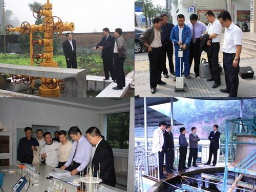在射洪自来水公司和大英自来水公司,金总一行先后察看了两家公司的制水工艺流程和水质检验中心,分别召开座谈会,听取射洪自来水公司总经理李旭东和大英自来水公司总经理廖天光所作的安全工作汇报。金总充分肯定了两家自来水公司的安全工作,并提出了以下具体要求:一是要全力防止水质公共卫生事件的发生,尤其要重视对水源水的检测和监控,调查分析取水口上游企业可能对水源造成的污染并做好应对预案;二是要严控进入关,加强门卫制度和对高危化学品的进货途径管理和储存管理;三是加强对水厂重要区域的监控和管理,充分利用现代技术手段,既防止外人进入厂区破坏,又保护生产者;四是针对监管难度较大的水质二次污染情况,要紧紧依靠政府相关部门,制定制度并定期开展整治工作;五是引进并充分利用先进技术设备,建设能满足新水质标准的水质检测中心,确保安全平稳供水。