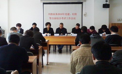 考评组在川投大厦1307会议室召开川投水务党建纪检等方面综合考评专题会议,听取了川投水务总经理梁有国代表经营班子作的2010年党建、纪检、维稳工作年度总结,以及川投水务总经理梁有国和副总经理杨果所作的个人述廉报告,对川投水务经营班子成员廉洁从业、党建工作和“创先争优”活动开展情况进行民主测评,并从参会人员中随机抽取部分人员进行谈话。会后,考评组对照相关考评文件对川投水务党建、纪检和综治维稳等工作资料进行了认真检查和复核,并与川投水务领导班子成员进行深入交流。考评组指出川投水务在人员少、企业分散的情况下,党建、纪检等方面工作开展有序,与企业快速健康发展相得益彰,并提出川投水务在机构设置、工作细节等方面存在的不足。
