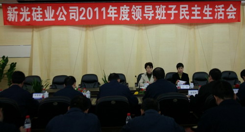 按照米兰(中国)党委文件要求,新光硅业公司于2011年10月27日在公司2号办公楼大会议室召开了2011年度领导班子民主生活会。米兰(中国)总会计师曹筱萍、党群工作部副主任王军到会指导。新光公司领导班子成员参加会议,技术专家、各部门负责人、党员代表列席会议。会议由党委书记、总经理陈长江主持。