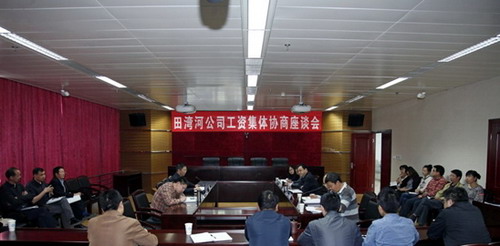 为推进公司和谐企业建设、构建和谐劳动关系,维护职工的合法权益,促进公司和谐稳定健康发展,4月16日,田湾河公司在成都远控中心三会议室召开工资集体协商座谈会。职工方协商代表,工会主席刘凤鸣,公司职工董事卢建奎,工会副主席、公司民主管理委员会主任熊宇,工会委员、女工委员会主任王洪英,工会委员闫诚;公司行政方协商代表,总经理孙志祥,副总会计师杨利,总经理助理、行政管理部主任段明,人力资源部主任张太生,资金财务部副主任刘静出席了座谈会。公司非生产值班员工全程列席旁听了座谈会。座谈会由刘凤鸣主持。