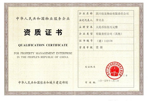 2012年12月3日,四川佳友物业有限责任公司正式获得由国家住建部颁发的物业服务企业一级资质,标志着佳友物业的服务水平已经得到了行业主管部门和市场的广泛认可,不但扫清了市场运作和项目发展方面的障碍,也为跻身于全省先进物业管理企业行列奠定了坚实的基础。