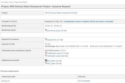 联合国气候变化框架公约网站关于田湾河大发水电站CDM项目通过首次签发页面