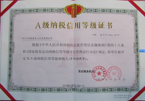 6月27日,中电福溪公司从众多参评企业中脱颖而出,再次荣获宜宾市国家税务局和地方税务局联合颁发的《A级纳税信用等级证书》,得到了政府和社会公众的广泛认同,树立了良好的纳税形象。