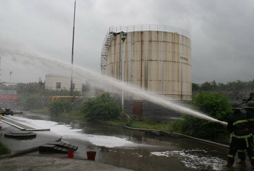 演习设定,运行值班人员在发现油库着火情况后,迅速采取现场关闭进出口油阀,并用泥沙将因油泵房附近近200公升的积油形成的流动火隔离,同时将火情迅速上报,公司立即宣布启动油库着火应急预案。随后各参演单位迅速到位,在抢险应急指挥部的指挥下,对燃油系统进行了隔离,并切断了油库区所有电源,并迅速疏散周边人员,设置了警戒线,消防队员快速利用油罐区内的固定泡沫灭火装置的泡沫枪和消防车的泡沫枪从各个方向集中对准火源中心处喷射,封住火焰使油气隔绝缺氧熄灭。同时,参演义务消防人员迅速赶赴现场协助专职消防队进行灭火。
