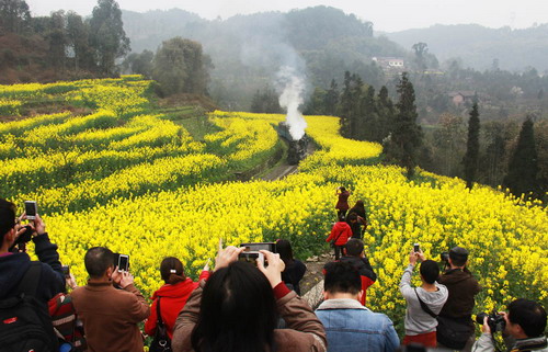 如此火爆的旅游景象跟旅游公司开展的系列有效的工作是分不开的,从景区打造升级、知名度提升,段家湾、亮水沱两处观光亮点的提升,更有层次感的观光平台的打造,特别是段家湾景点由原来的静态观光变成现在的动态观光,游客有序地站在观光平台上欣赏小火车喷着蒸汽从油菜花海中逶迤前行的表演,让游客充分领略小火车独特的魅力。除了硬件设施的提升外,旅游公司还从旅游服务和开拓旅游市场上下功夫,成立了专门的营销组,重点做好市场营销,通过网络平台、微信等发布策划丰富多彩的花季之旅活动,做到早宣传、早营销,扩大景区知名度。在运管公司的密切配合下,小火车运力上大大提升,实现每小时滚动发班,往年周末旺季的时候小火车每天发专列四趟,平时每天两趟;今年花季之旅周末每天发班10趟,多的时候15趟,就连平时淡季每天四趟也是满满当当,就这样都还不能满足成倍增加的游客量,旅游公司从容应对,推出了淡旺季小火车套餐价,及时增加短途观光车,推出新的观光内容,据悉,从3月13日开始,周一到周五小火车将每天增发六趟观光专列,最大程度满足淡季出行的游客。