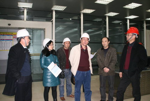 施晓川副巡视员(中)一行在公司总经理李胜章(右一)、党委书记唐得旗(左一)的陪同下,参观了正在运行中的两台600MW机组,向当班值长详细了解了机组运行状况,并在现场听取了李胜章总经理就公司安全生产经营、节能环保、煤炭存储等工作的汇报。