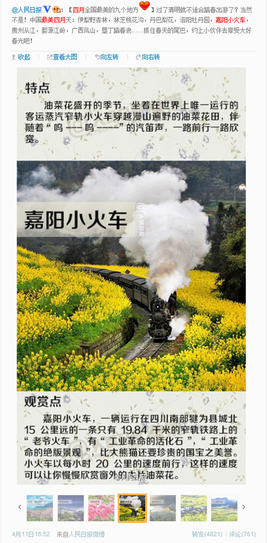 4月11日,人民日报通过新浪官方微博推荐“四月全国最美的九个地方”,徜徉在灿烂花海中的嘉阳小火车以“老爷火车”的姿态傲居榜单。微博以图配文的方式介绍嘉阳小火车为“工业革命的活化石”、“工业革命的绝版景观”,堪称是“比大熊猫还要珍贵的国宝”。微博一经发布,人民网、扬子晚报、央视经济之声等主流媒体便相继予以转发,嘉阳小火车独特的时代印记和年代特征更引来网友们的热议和追捧,纷纷表示“好想去坐小火车”、“人生不愿错过的一次旅行”,直言“仿佛又回到十八世纪前,去追寻那一段渐渐远去的历史”。(刘文婷)