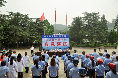 “报告梁总,四川川投水务集团射洪有限责任公司突发性水质污染应急演练各项工作准备就绪,请指示。”