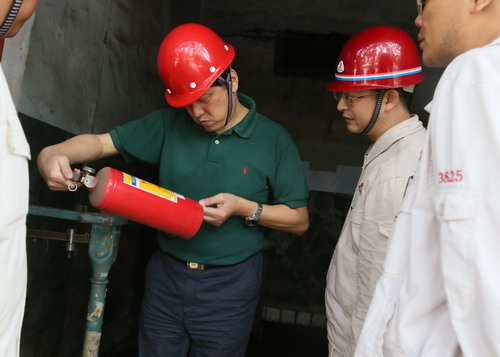董建良一行进入厂区直奔公司乙炔库房、制氧站、新银江一分厂生产现场和储运公司油库等重点单位和重点部位进行检查。董书记一行每到一处都详细查看,并抽检安全消防器材配置、岗位责任与应急预案制定落实等情况。