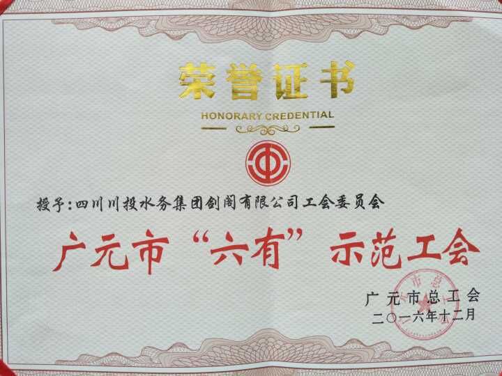 2016年以来,川投水务剑阁水司会认真按照习近平总书记“三个着力”要求,贯彻落实“三满意”经营宗旨,广泛开展“六有”工会建设和“双争”活动,全面推进“基层工会建设落实年”活动,各项部署落地见效,充分发挥组织动员职工、教育引导职工、联系服务职工和维护职工合法权益的重要作用。近期,被广元市总工会评为“六有示范工会”单位。