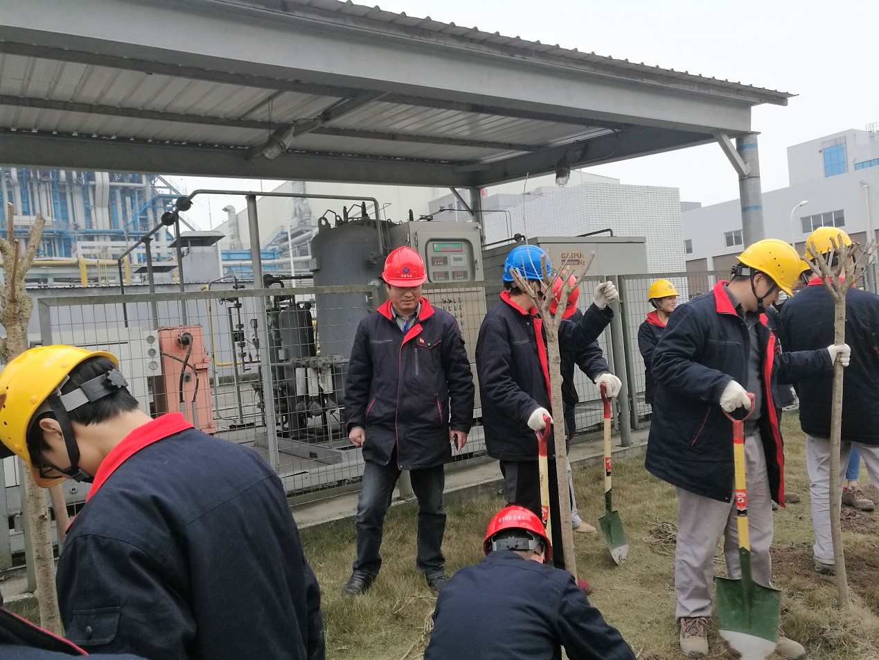 阳春三月万物苏,植树播绿正当时!在全国第39个植树节到来之际,2017年3月9日下午,在党群纪检部的统一组织和公司党委副书记姚欣的带领下,参加植树活动的40余名党员、入党积极分子、志愿者秩序井然地到生产区天然气调压站、办公楼楼下、公司大门口等处,开展义务植树活动。