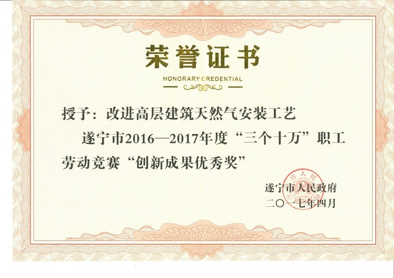 2017年7月14日,川投水务宏源公司技术协会创新项目“改进高层建筑天然气安装工艺”被遂宁市人民政府授予:遂宁市2016-2017年度“三个十万”职工劳动竞赛“创新成果优秀奖”,这是全市创新成果奖39个项目之一。