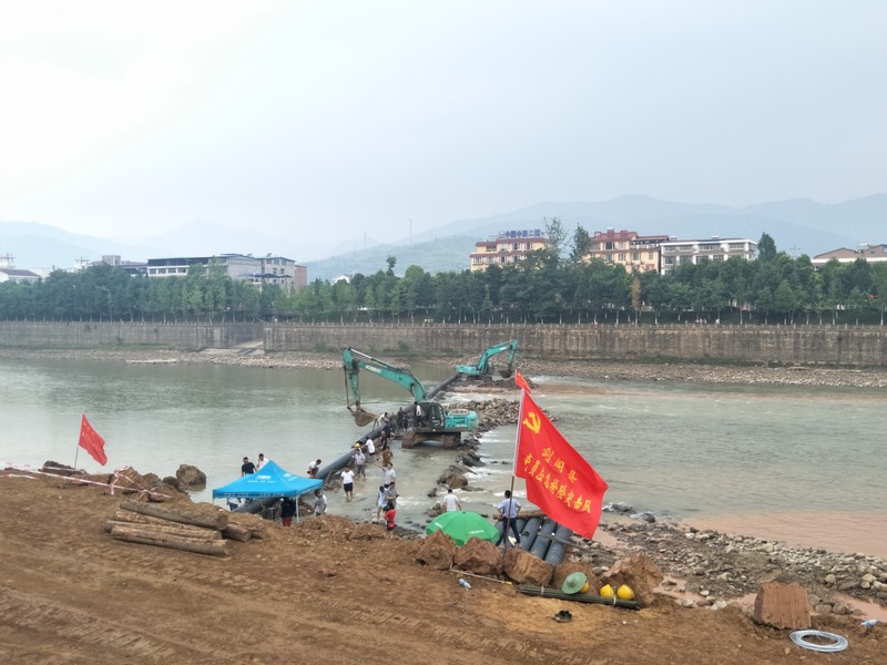 险情就是命令,7月10日,川投水务剑阁水司得到紧急通知,因剑阁县遭受强降雨袭击,造成剑阁县备用水源龙王潭水库至县城输水管道被洪水冲毁,为尽快抢修好输水管道,让县城居民早日用上龙王潭水库安全洁净的水,剑阁县主要领导、县水务局相关领导纷纷致电,希望剑阁水司能担当大局,尽快修复输水管道,确保县城人民饮水安全。10日下午15时,为主动为政府分忧解难,经公司研究决定,剑阁水司成立了龙王潭水库至县城输水管道(清江河跨河管道)应急抢修工程领导小组,明确了各职能部门抢修职责,将责任层层压实,并第一时间调遣两台挖掘机,人停机不停连续作战在清江河床进行挖掘工作,随着过河钢管吊至清江河畔,剑阁水司为保证此次县城保水维稳前期工作顺利进行,彰显了“让社会满意、让员工满意、让投资者满意”经营宗旨,受到抢险施工场地现场慰问的县委书记向永东等县级领导高度肯定。